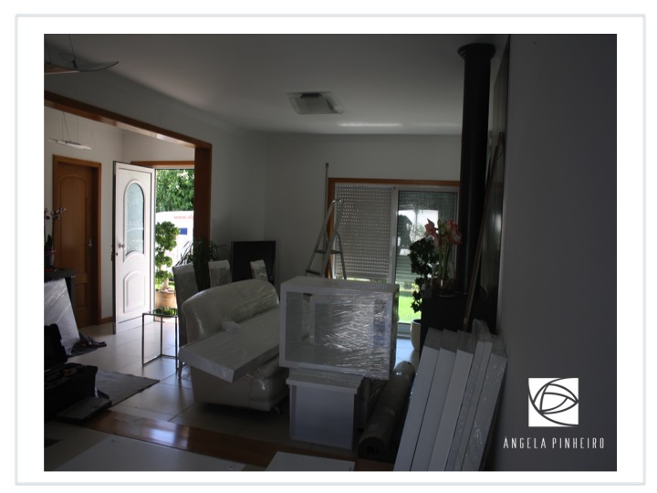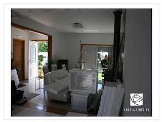 A remodelação de uma sala. Tínhamos um sofá antigo na cor creme que foi estofado de branco, aproveitamos as cadeiras, móvel tv, aparador, e espelho todos em wenguê. Não sou fá desse tipo de acabamento e como neste caso o objectivo era mudar o ambiente, tornar uma casa funcional, acolhedora, harmoniosa e leve decidimos lacar todo o mobiliário.