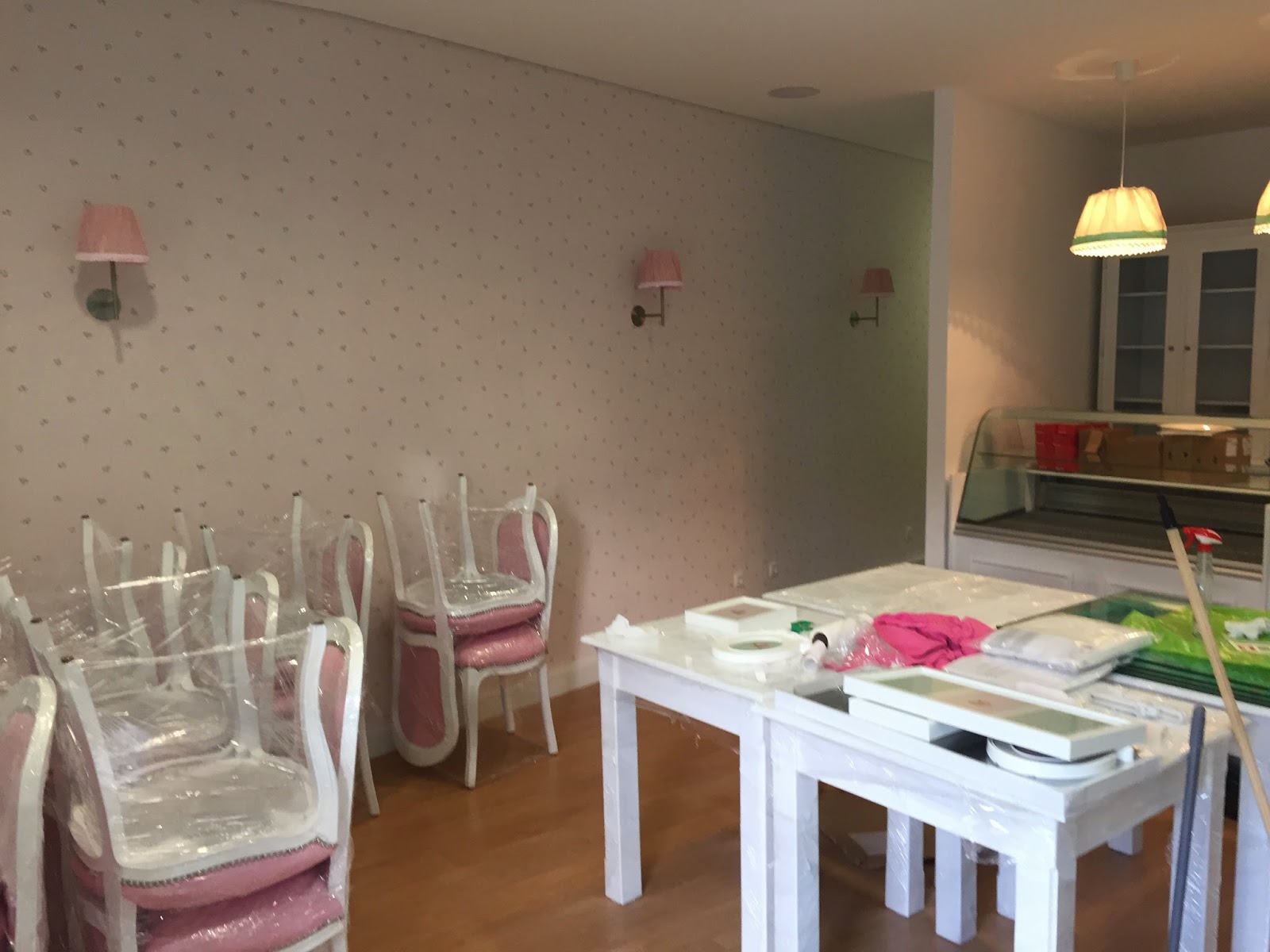 A seguir ao almoço ainda só tinham o balcão e as mesas.... no final da tarde começamos a colocar as cadeiras e os restantes elementos decorativos.