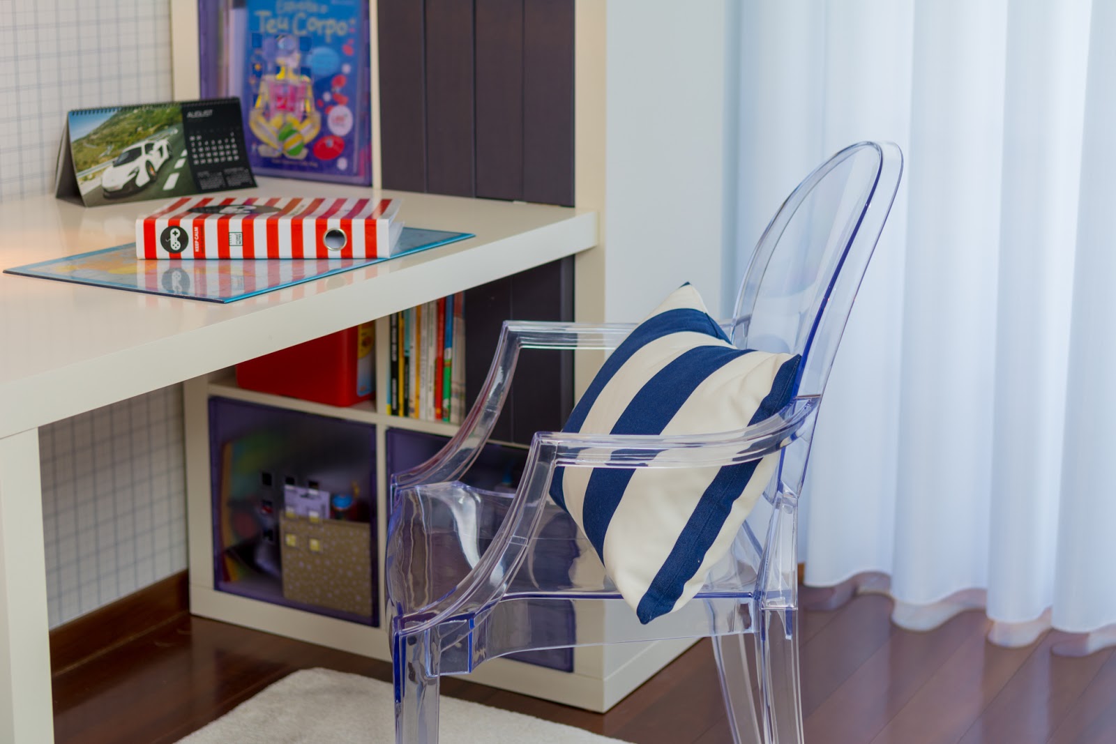 A secretária já existia, mudamos de local, colocamos nova decoração e no final ficou muito bem enquadrada.