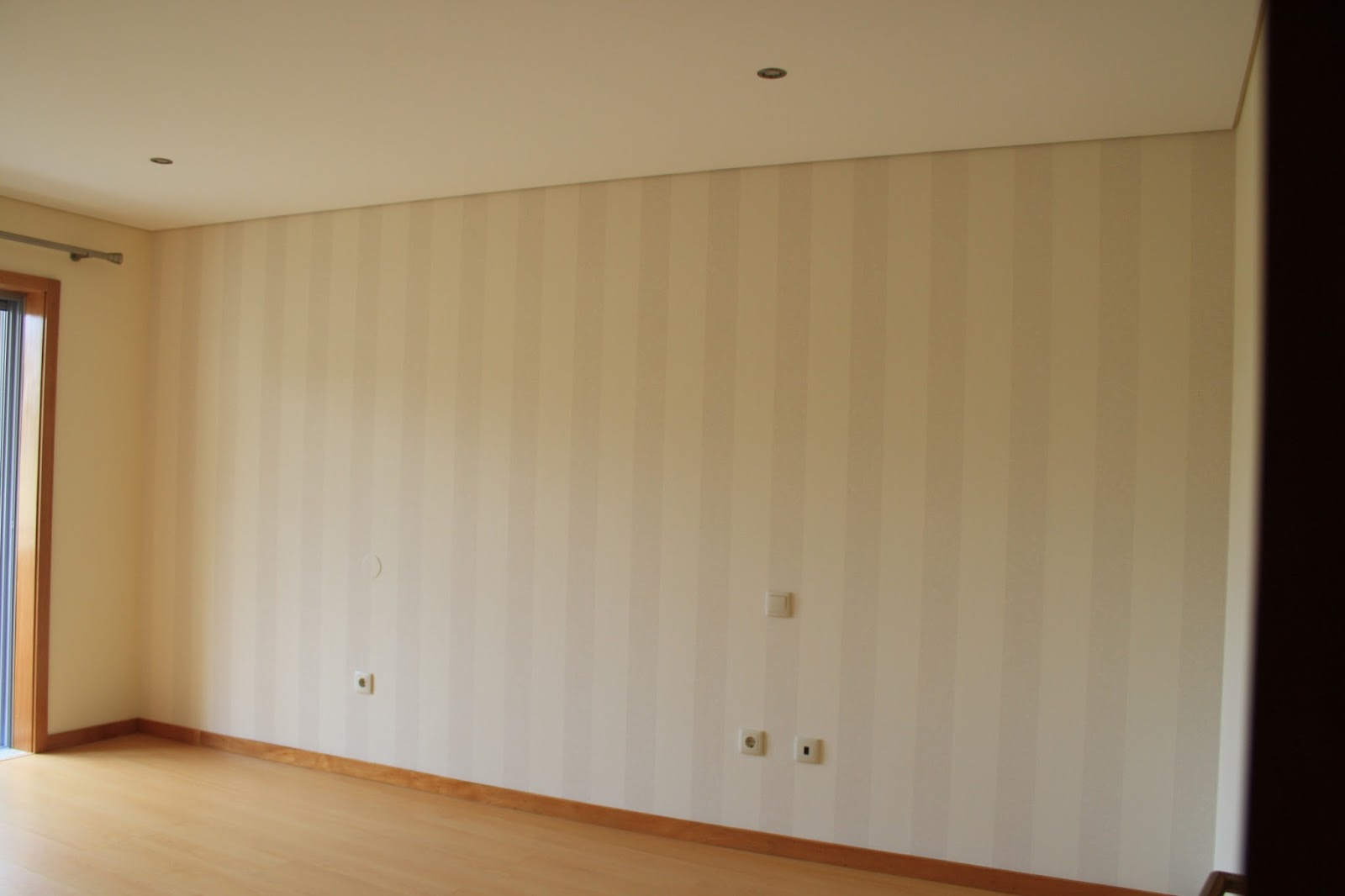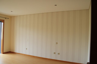 O papel de parede é simples de linhas rectas, que foi conjugado com a linhas da cama e da manta o que resultou na perfeição.