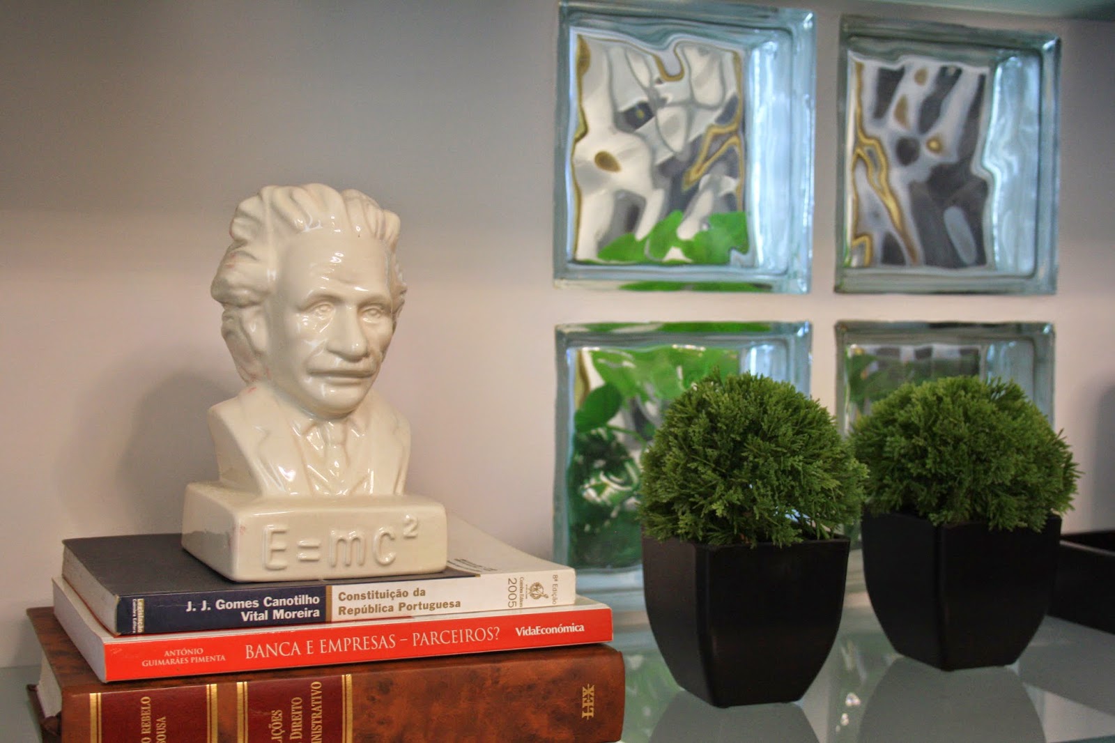 Nesta obra, fizemos a consultoria e colocamos objetos decorativos. Já existia o painel de TV, que diga-se de passagem é espetacular e foi realçado com este candeeiro que colocamos de leds.